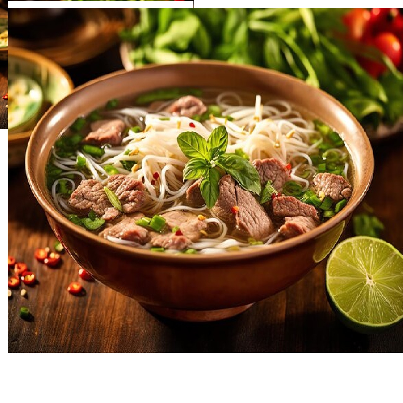 Reisbandnudelsuppe mit Rindfleisch und Rindfleischbällchen, Frühlingszwiebeln und asiatischen Kräutern